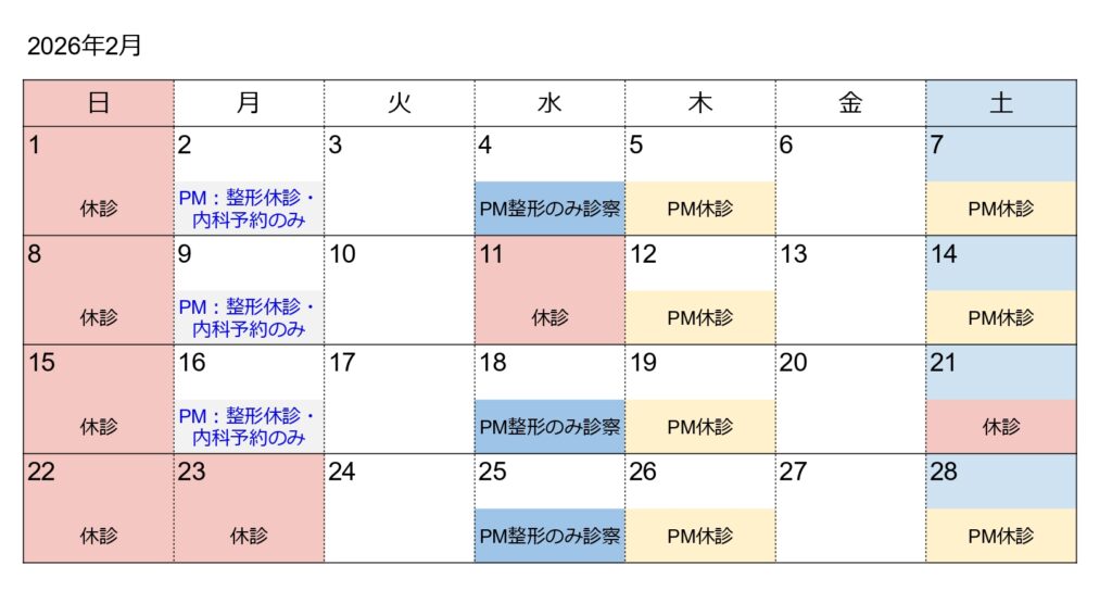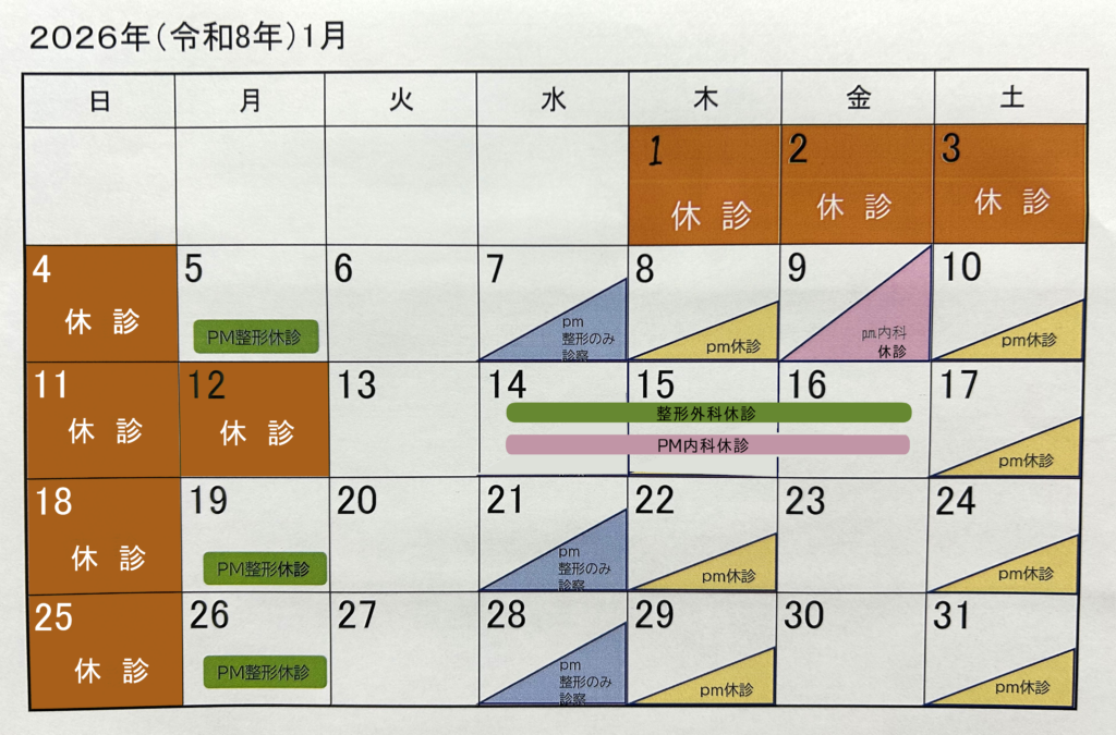 1月14日(水)から16日(金)まで整形外科休診・内科午後休診です。
